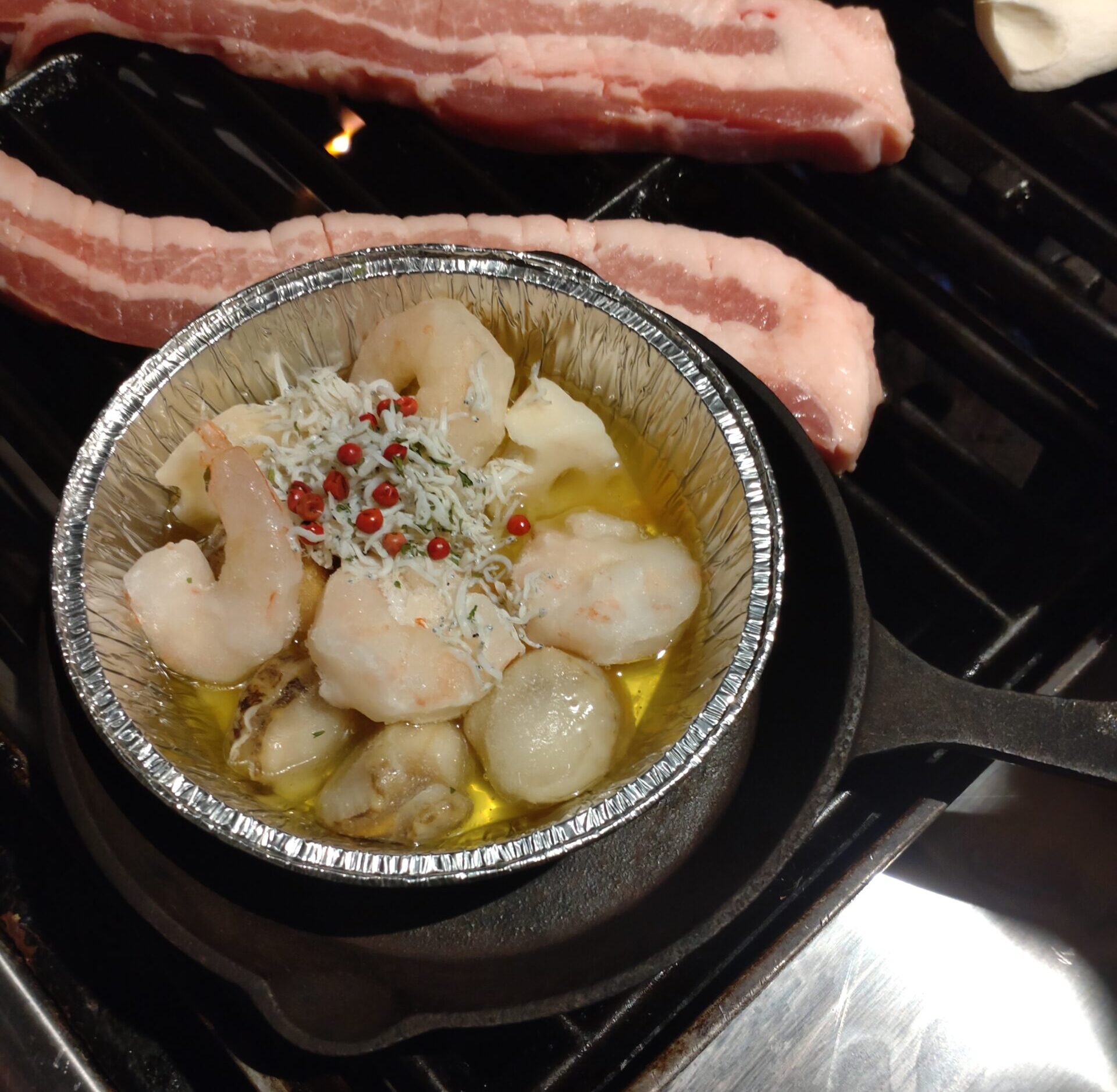 アヒージョは熱がなかなか伝わりにくいので一番初めに置いた方が良いです。